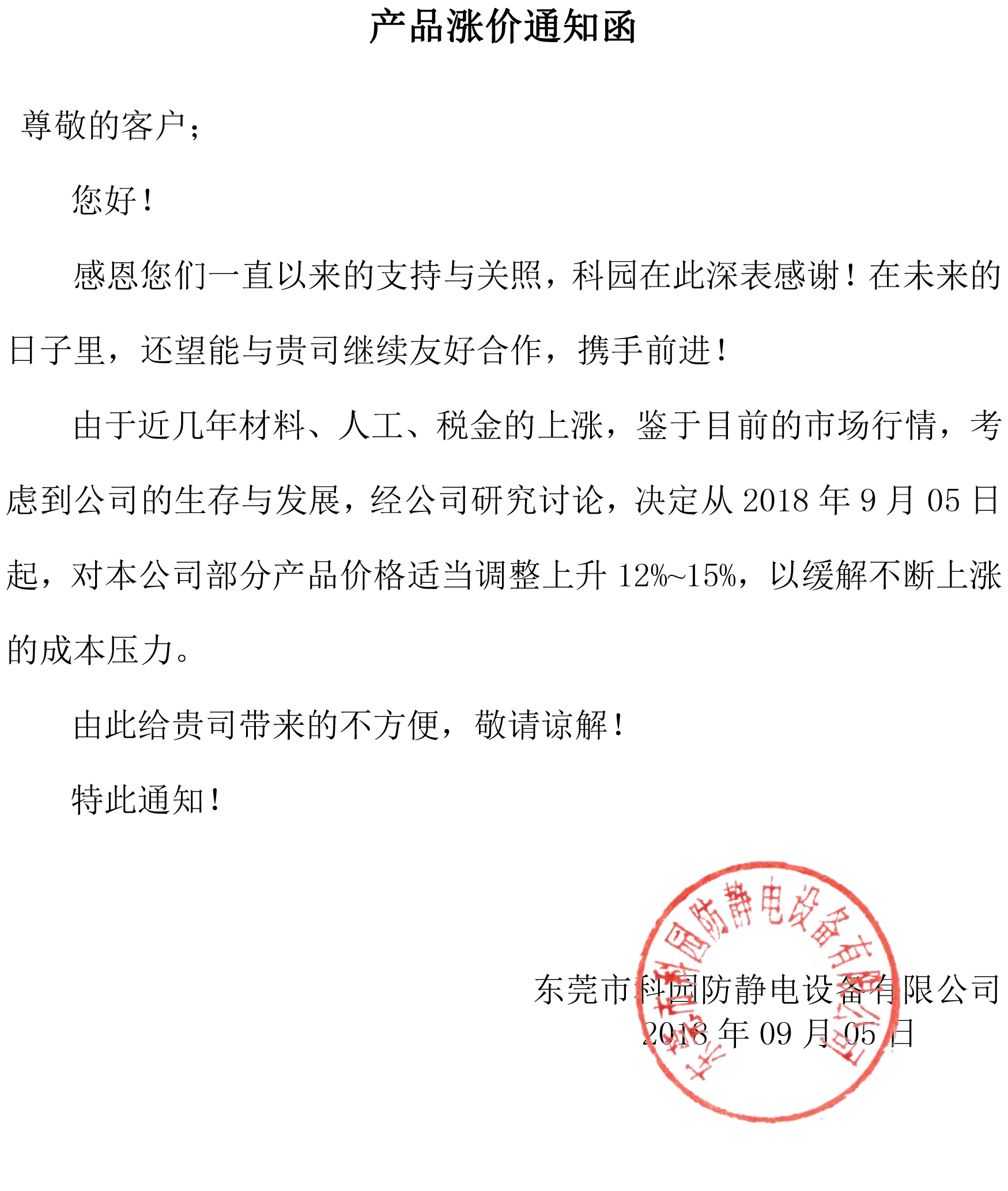 由于近幾年材料、人工、稅金的上漲,鑒于目前的市場行情,考慮到公司的生存與發展,經公司研究討論,決定從2018年9月05日起,對本公司部分產品價格適當調整上升12%~15%...