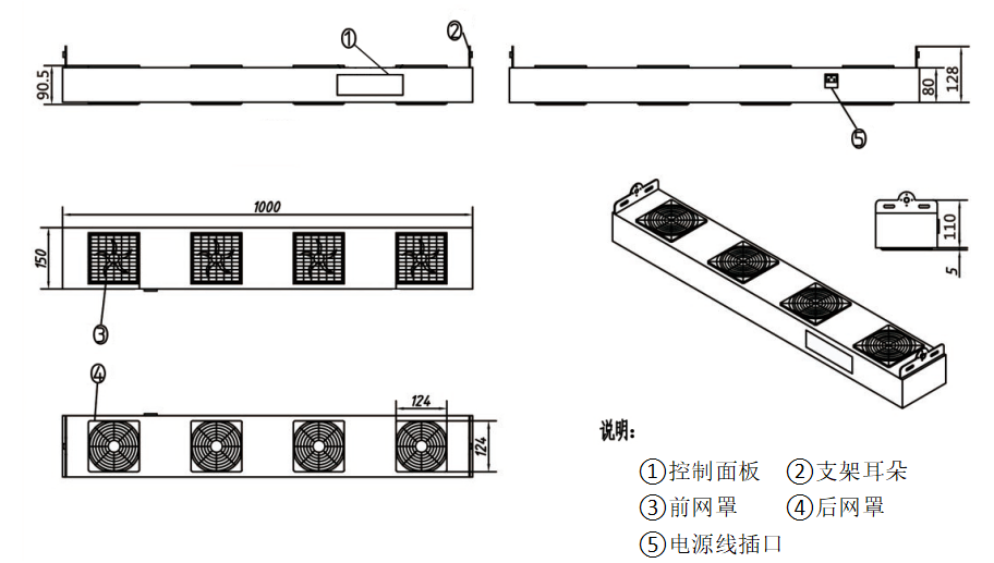 1000mm(L)*150mm(W)*80mm(H)(含支架耳朵)